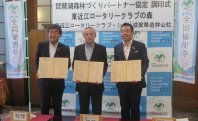 今回の協定は、東近江ロータリークラブが60周年を機に、将来に向けた持続可能な事業として「琵琶湖をまもる」森づくり事業に取り組みたいとの意向から締結に至ったものです。2019年7月に締結しました一般社団法人滋賀県トラック協会との協定に引き続き2例目の協定締結となります。